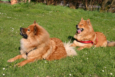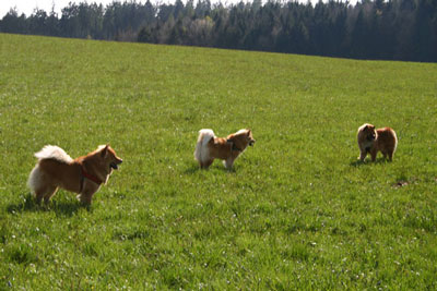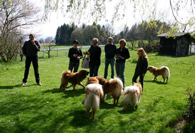 Bei prächtigem Frühlingswetter unternahmen wir am Ostermontag einen Spaziergang. Die inzwischen 11 Monate alten Junghunde des B-Wurfs (Barbarossa, Beauty-Kira und Birdy) erkannten den Garten ihrer Welpenzeit sicher wieder und begrüßten auch ihre Mama Kiri und Onkel Felix mit viel Respekt (links Barbarossa und Birdy, rechts Beauty-Kira).